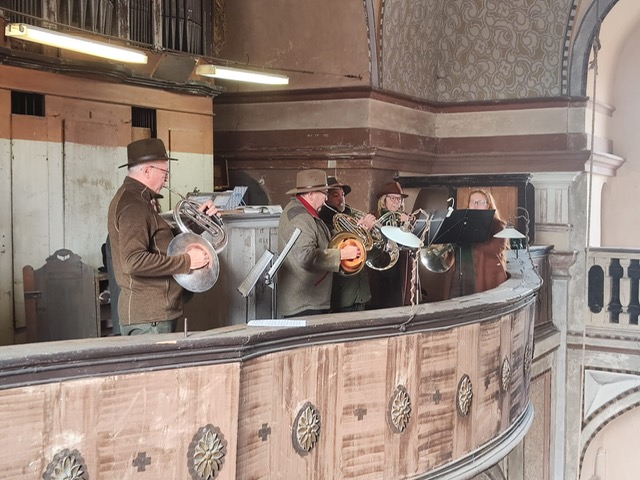 Po skončení mše následovalo přátelské setkání před kostelem, kde ještě zazněli staré lovecké fanfáry.